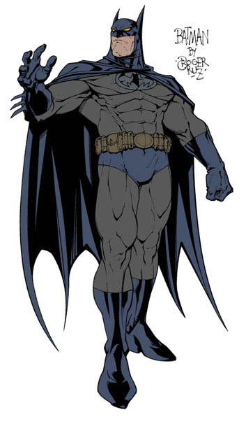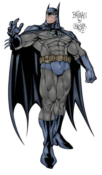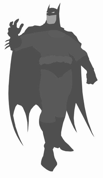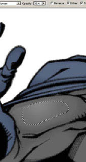Ahora, utilizando la herramienta brush con un pincel suave en modo screen pintamos en diversas partes de la imagen, determinando el origen de luz para Batman. Utilizando la herramienta "Magic Wand" seleccionaremos las diferentes áreas de color a pintar dentro de la imagen, usando como referencia nuestro Alpha channel. Pintaremos utilizando el mismo color de base, pero nuestro pincel debe estar en modo screen. El resultado es algo como esto: |