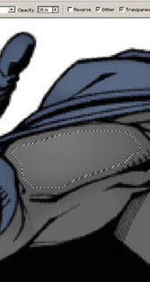 Cuando todo el Batman esté completamente coloreado, un secundario origen de luz ayudará a acentuar el realismo de la imagen. Con un tono amarillo pálido y utilizando un pincel suave en modo screen, añado algunos puntos extra de luz aquí y alla. |